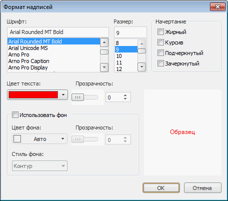 Для настройки формата надписей используйте диалог «Формат надписей», аналогичен вкладке «Шрифт»: