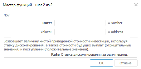 Возвращает величину чистой приведенной стоимости инвестиции, используя ставку дисконтирования, а также стоимости будущих выплат (отрицательные значения) и поступлений (положительные значения).