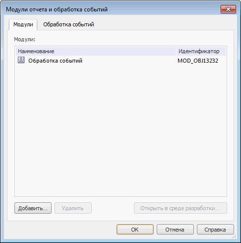 Для работы с обработчиками событий перейдите на вкладку «Обработка событий» диалогового окна «Модули отчета и обработка событий».