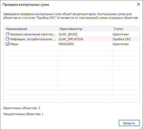 В окне отображается таблица, содержащая результаты проверки предыдущей контрольной суммы с текущей. Для объектов отображаются идентификаторы, наименования и статус проведенной проверки.