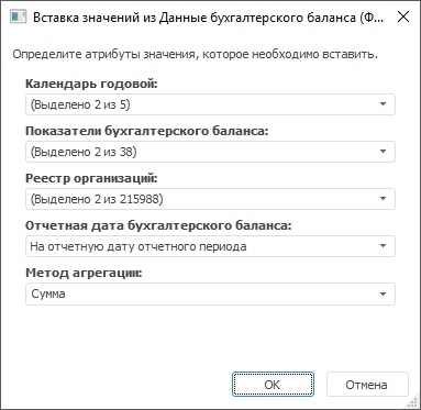После выбора источника данных отобразится диалоговое окно «Вставка»: