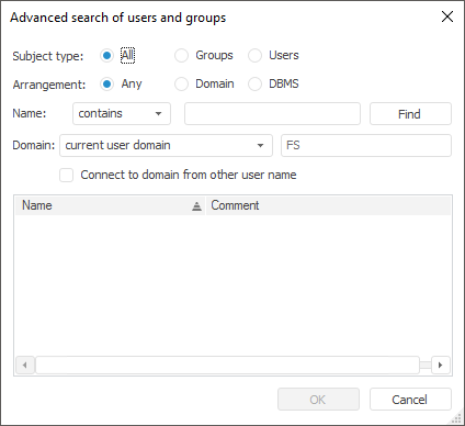 Subject type, arrangement, user name or group name are set identically to the dialog box to select users and groups without advanced search.
