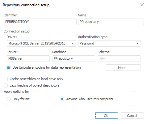 Password. In the repository login dialog box, the user must explicitly state his name and password. The authentication type will be available for all DBMS, except SQLite.