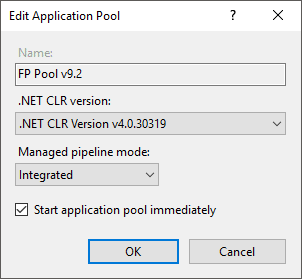 Correct operation of components of Foresight Analytics Platform web application requires virtual directories created by standard means of Internet Information Services: FP_App_v<X>x64 and FPBI_App_v<X>x64, the pools: FP Pool v<X> and FPBI Pool v<X>x64, where <X> is a version of Foresight Analytics Platform. For example, names of virtual directories for Foresight Analytics Platform 9.2: fp_App_v9.2 x64 and fpBI_App_v9.2x64, the pools fp Pool v9.2 and fpBI Pool v9.2 x64.