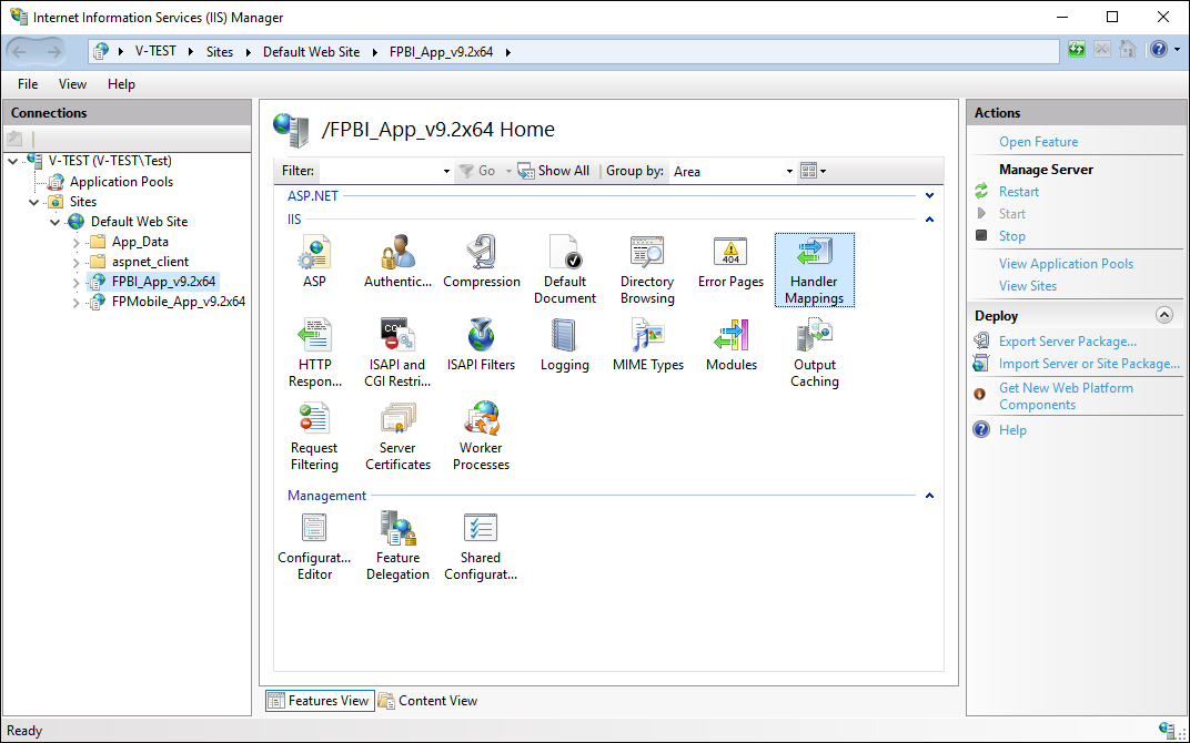 1. In the Connections tree select the fpBI_App_v9.2 x64 virtual directory and double-click Handler Mappings:
