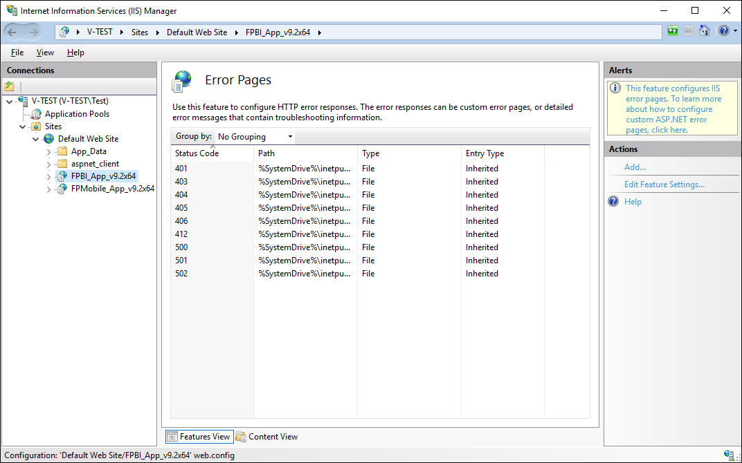 1. On the Actions panel select Edit Feature Settings. The Edit Error Pages Settings dialog box opens: