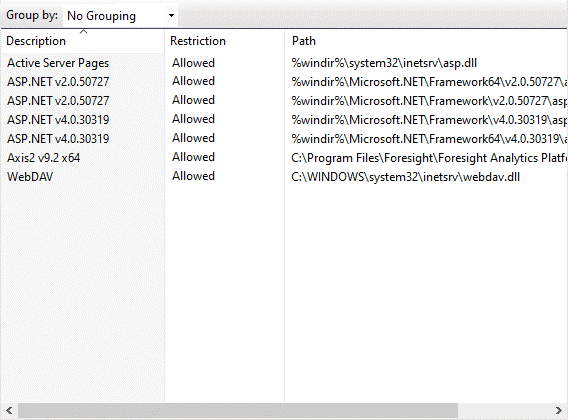 For the ASP.NET v4.0.30319 and Axis2 v9.2 x64 strings the Restriction column must display Allowed: