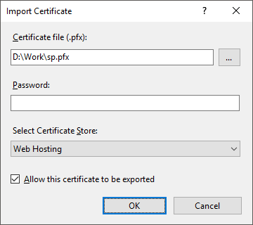 Import the obtained certificate, as the certificate store select Web Hosting: