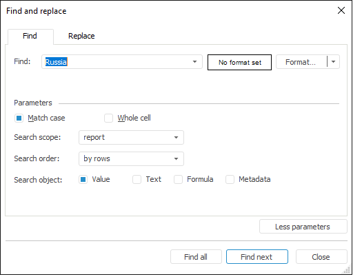 NOTE. Default search is executed in the entire report by rows, without accounting the format of searched cells and other parameters. Search is executed by value in the table cells.