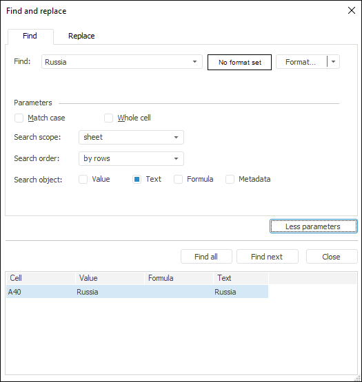 To find and replace data, use the Find and Replace dialog box. If one cell is selected, data search and replacement involves the entire table. If a cell range is selected, data is searched and replaced only in the selected cell range.