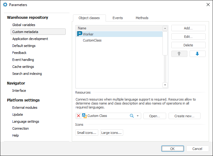 The list of custom classes is set in repository parameters on the Custom Metadata > Object Classes tab.
