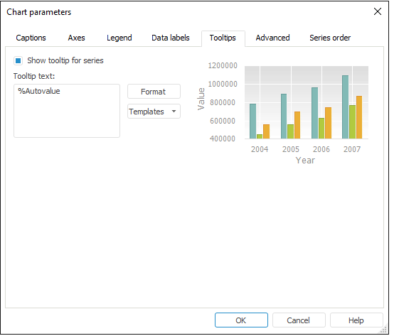 To set up tooltips for data points, go to the Tooltips tab of the Chart Parameters dialog box.