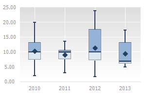 Box charts are used to analyze one or several data sets in the graphical view. This type of chart can be used to compare distributions between several data groups or sets. For each data group or data set the following calculations are made: center statistics (median, average) and range statistics (quartiles, standard deviations) for various periods of time and the selected values are displayed on the chart.