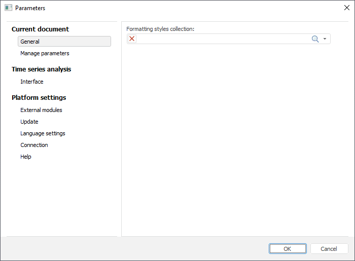 To set up parameters of the Time Series Analysis tool, and general parameters of Foresight Analytics Platform, use the Parameters dialog box.