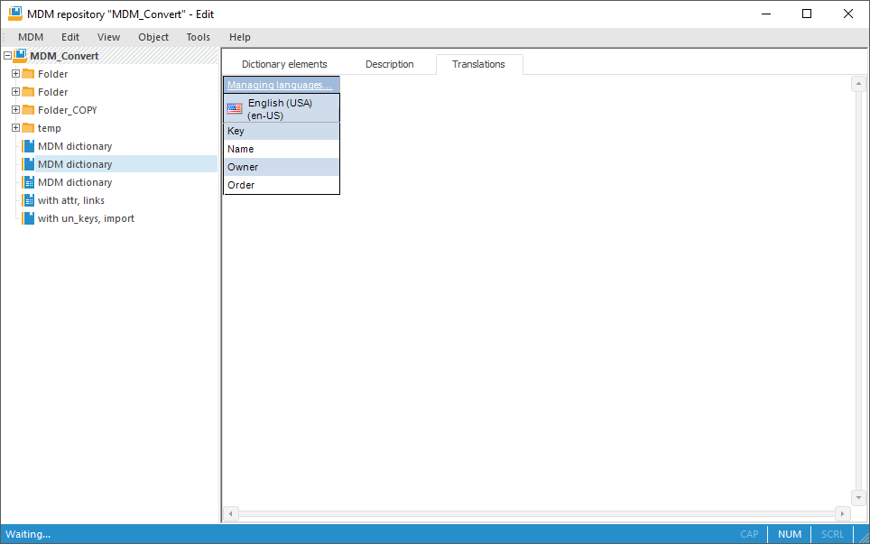 In the desktop application it is available to create multilingual MDM dictionaries, that is dictionaries containing translation of attributes and elements into various languages. Those dictionaries support displaying into various languages in the desktop and web application. If multilingual MDM dictionary is used as dimension in cube or time series database, then on changing repository language for current user elements of the corresponding dimension will be displayed in selected language.