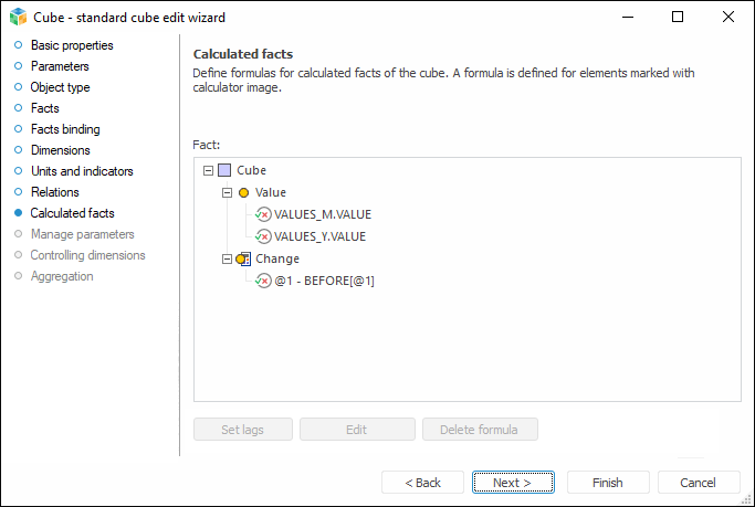 The Calculated Facts page is used to set formulas for calculated facts. Calculated facts is a function from values of other facts, calculated facts or relations.