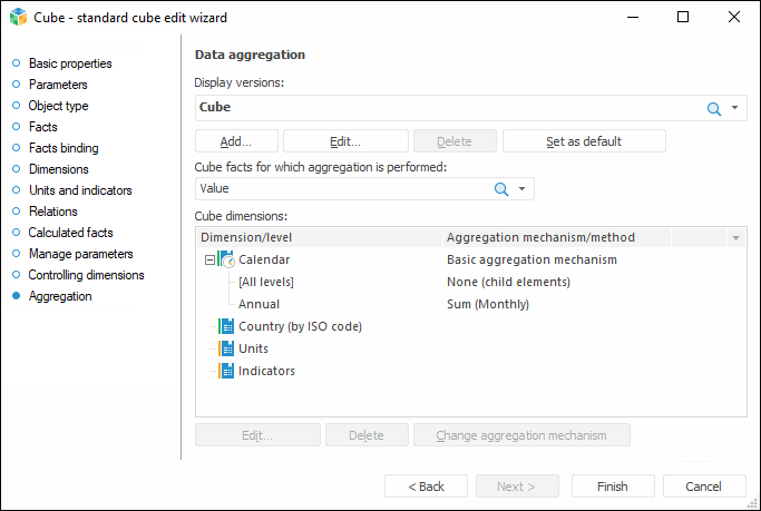 This page is used to set up display versions and aggregation for cube dimensions. A detailed description of setting up various aggregation mechanisms is given in the Aggregation by Dimension Levels section. Disaggregated data is extracted on opening the cube. Data is aggregated in the opened cube in the client workstation.