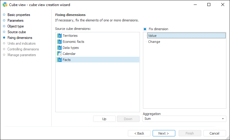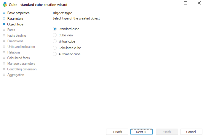 - Standard Cube. Structure of a cube is determined by the set of dictionaries and the combination of facts. Facts describe the data stored in dimensions that are determined by a set of cube dictionaries. In other words, dictionaries determine the coordinate axes of the cube, and facts determine various different in each point of the obtained coordinate system. Except for the facts that store data, calculated facts and relations can be created in a cube. Calculated fact values are determined by formula based on data of other facts or relations. Relations enable the user to get fact values by shifting towards the current calculation point. It enables the user, for example, to calculate difference between the current and any previous or next value. Various types of data aggregation can also be set up in cube.