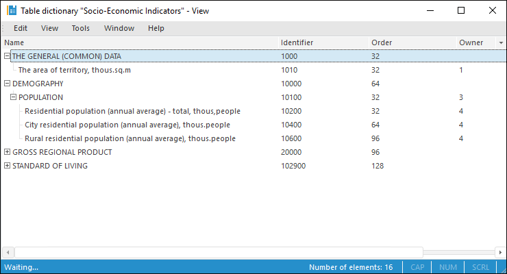 In the multidimensional model of data, dictionary elements play the role of indexes, which are used to create a coordinate vector of indicators stored in the cube cells. Each dictionary element has a set of attributes such as element name, unique code, and element order in the hierarchy. When elements in the dictionary are combined, the hierarchy – the most important property of a dictionary – emerges. As a rule, hierarchy is displayed as a tree, which nodes contain dictionary elements linked with attributes of ownership.