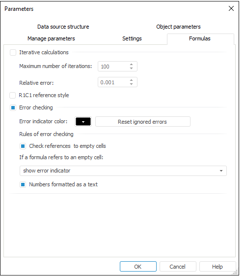 Error Checking Options. The command opens the Report Parameters dialog box on the Formulas tab.