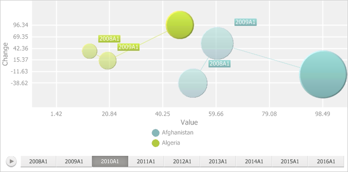 A bubble trace enables the user to see bubble trajectory in time. The trace is drawn from the beginning of timeline to the current time value, previous bubble values are drawn in a lighter shade of the color used to draw the current value, for example: