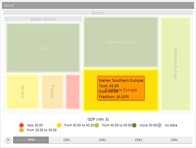 After the example execution the tree map item named Southern Europe is filled with yellow color, and a tooltip with the border color of which differs from the item color, is shown for this item: