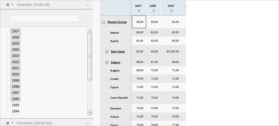 After executing the example the HTML page will contain the EaxDimBarMaster, EaxGrid and ChartBox components: