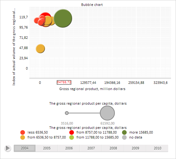 To execute the example, the HTML page must contain the component named bubbleChart (see BubbleChart component named bubbleChart (see Example of Creating the BubbleChart Component). Set new value of bubble chart area transparency, set left margin and bottom padding for bubble chart area, and define title of bubble chart area. Set new font and border for text label for X axis of the bubble chart area, redraw the text label, show total values of label width and height: