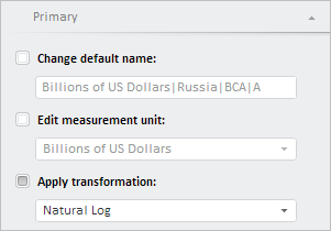 // Get workbook properties panel var propertyBar = workbookBox.getPropertyBarView(); // Get the Primary panel var mainSeriesPanel = propertyBar.getMainSeriesPanel(); // Display panel mainSeriesPanel.show(); // Expand panel mainSeriesPanel.expand(); // Refresh the Apply Transformation drop-down list propertyBar.updateViewAsMenu();