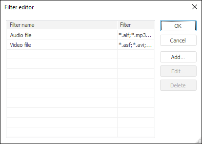 If filter is determined, only files which names and extension satisfy the filter conditions are available. Various file categories are determined in filter line using the | characters. Various conditions in one category are separated by the ; character.