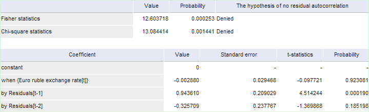The following is given for each statistics: value, statistics probability and the test result (whether the hypothesis of no residual autocorrelation is accepted or rejected).