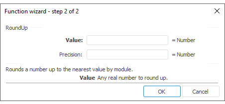 The function wizard for the RoundUp function looks as follows: