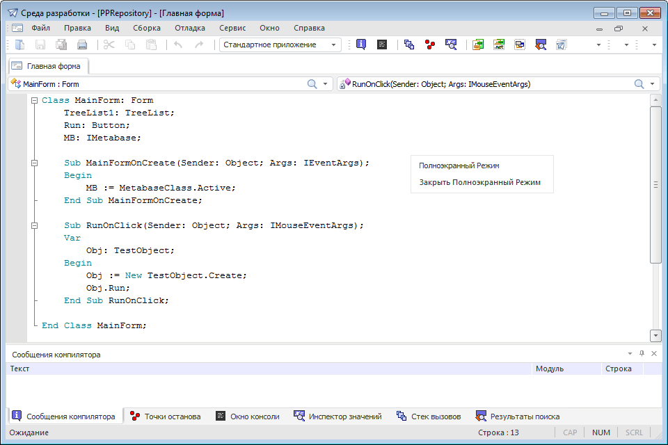Переход в полноэкранный режим осуществляется при выборе пункта меню «Вид>На весь экран»  либо при использовании сочетания «горячих клавиш» SHIFT+ALT+ENTER. Настройка выбранного режима отображения и расположение всех панелей сохраняются в реестр Windows и загружается автоматически при каждом запуске среды разработки.