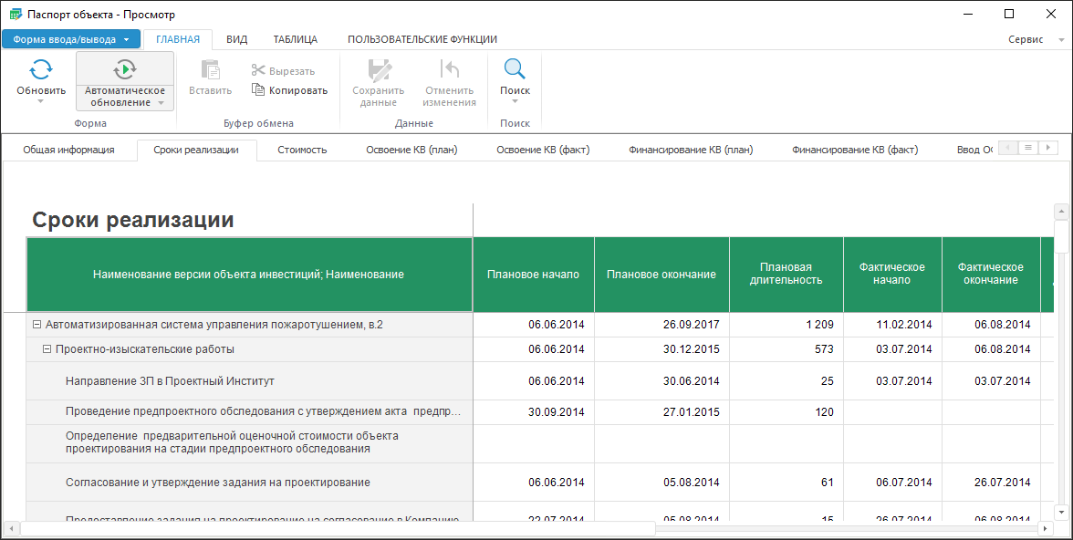 На листе формируется таблица, в боковике которой отображается иерархический перечень типовых этапов реализации объекта, а в столбцах отображаются плановые и фактические сроки реализации этапов. Для входа в режим редактирования значения в ячейке таблицы используется двойной щелчок.