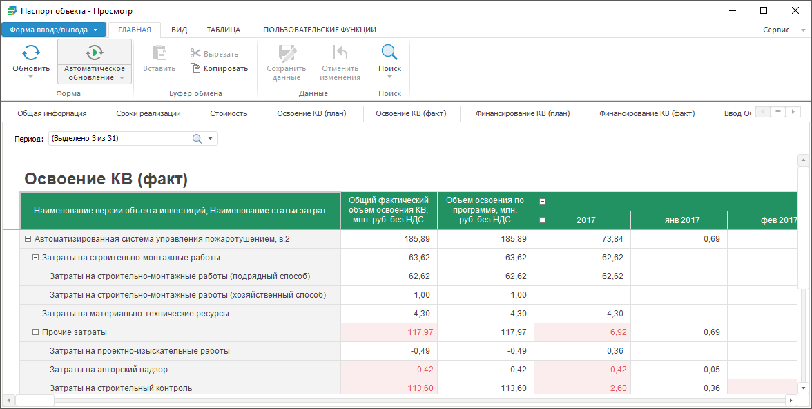В столбцы таблицы вводятся фактические суммы затрат, распределенные по календарным периодам (месяцам), входящим в срок реализации объекта. Для входа в режим редактирования значения в ячейке таблицы используется двойной щелчок.