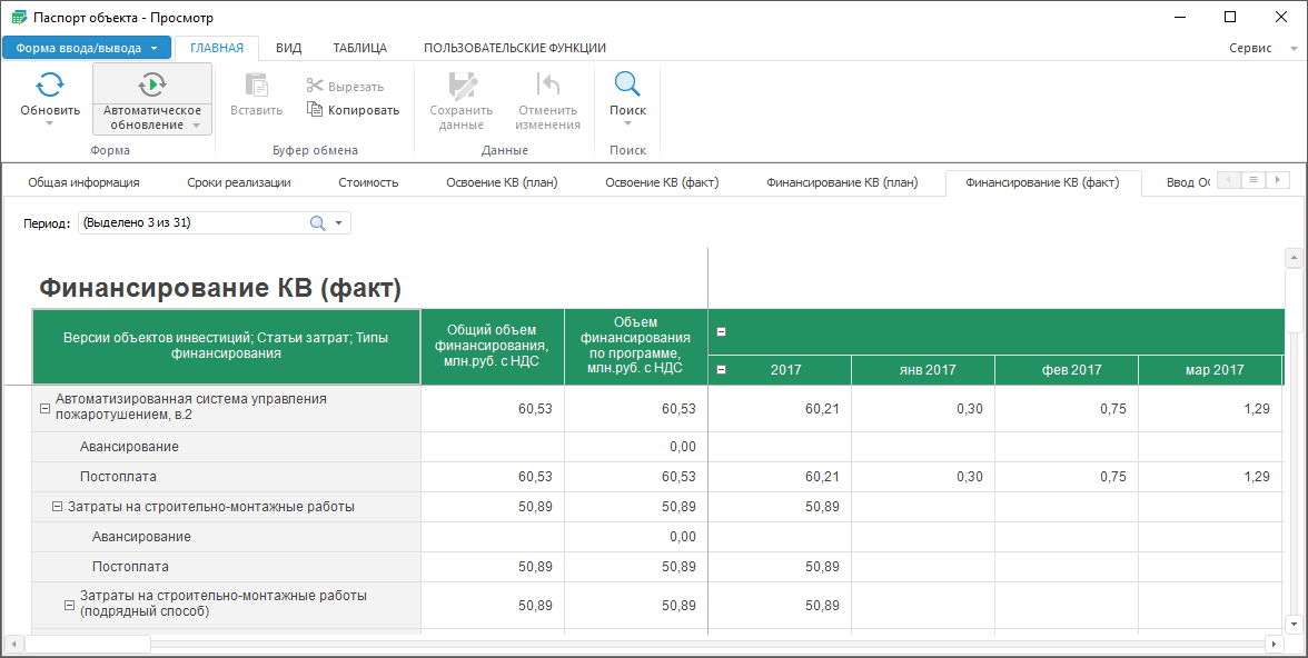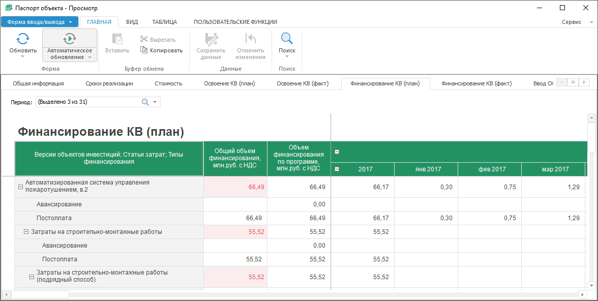В столбцы таблицы вводятся фактические суммы финансирования, распределенные по календарным периодам (месяцам), входящим в срок реализации объекта. Для входа в режим редактирования значения в ячейке таблицы используется двойной щелчок.