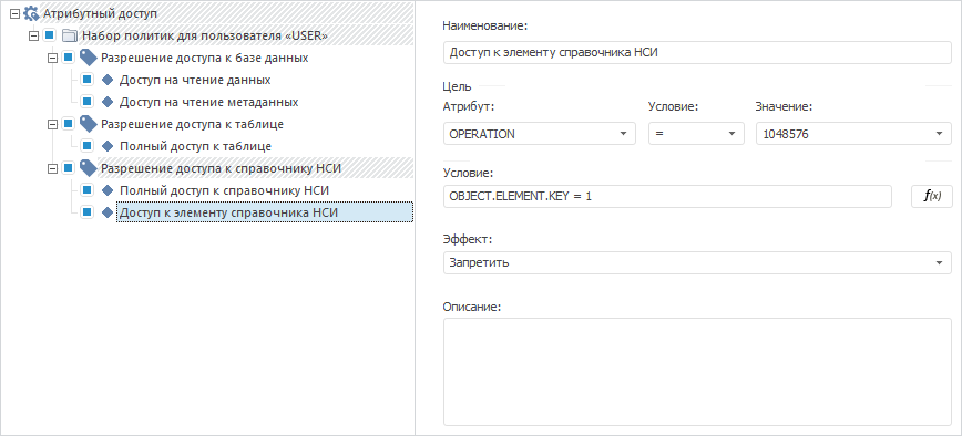 Рассмотрим пример запрета доступа пользователю на чтение элемента табличного справочника НСИ с ключом «1».
