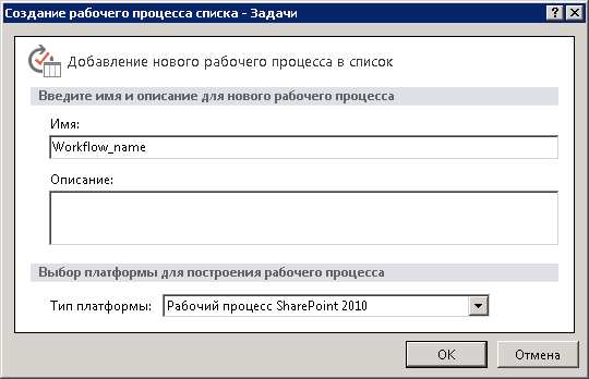 Тип платформы. Выберите тип платформы «Рабочий процесс SharePoint 2010».