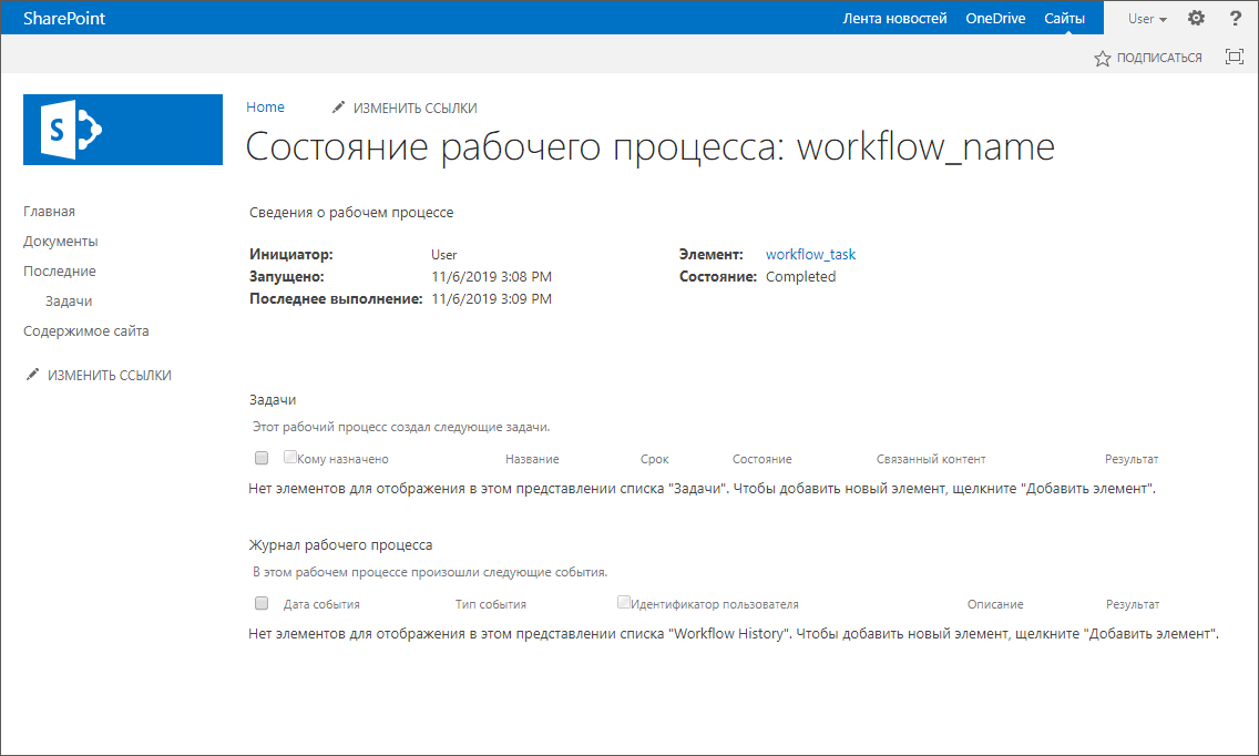 Для просмотра состояния рабочего процесса перейдите по ссылке напротив наименования процесса в списке задач. Будет открыто состояние рабочего процесса: