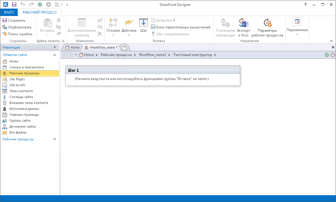 Настройте SharePoint Designer 2013 на работу с сайтом портала Microsoft SharePoint.
