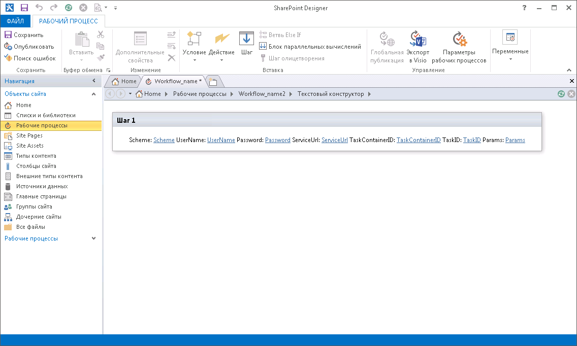 Нажмите кнопку «ОК». Будет открыто редактирование рабочего процесса: