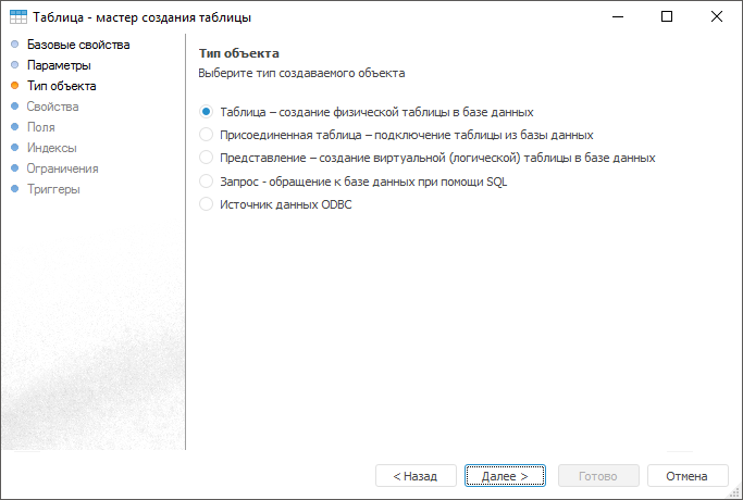 После выполнения одного из действий будет открыт мастер создания таблицы. На странице «Базовые свойства» укажите наименование объекта и идентификатор. На странице «Тип объекта» в списке отметьте тип создаваемого объекта - «Таблица»:
