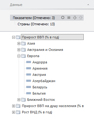 Вкладка «Данные» представляет элементы комбинированного измерения в виде дерева временных рядов.