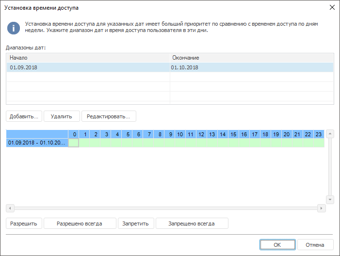 Важно. Запрет доступа по определенным датам имеет больший приоритет по сравнению с запретом доступа по дням недели.