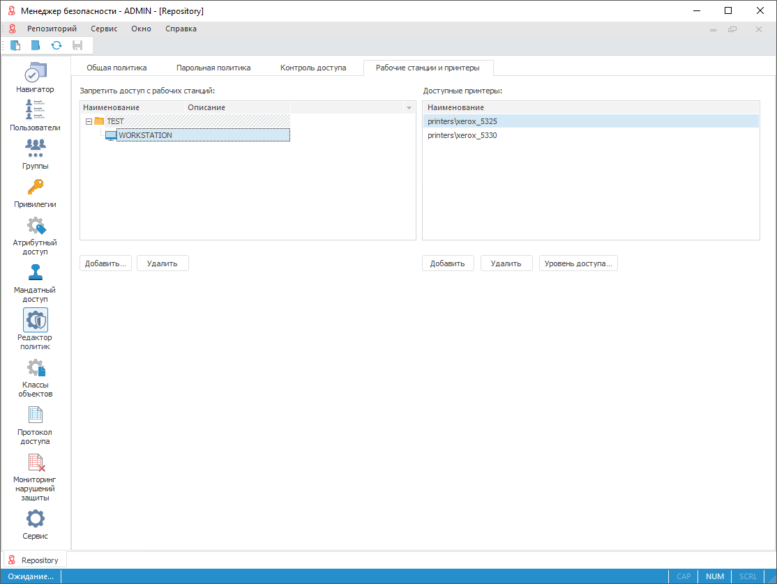 Настройка доступных принтеров определяет, на каких принтерах пользователи могут осуществлять печать. Если в области доступных принтеров список пуст, то печать доступна для любых принтеров.