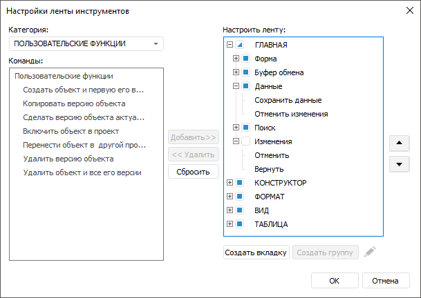 Для управления видимостью системных вкладок и групп и структурирования пользовательских кнопок в зависимости от выполняемых ими действий на ленте инструментов используйте диалог «Настройки ленты инструментов»: