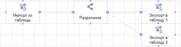 Предполагается наличие в репозитории трех таблиц: T_Source, T_DestinationOne и T_DestinationTwo. Структура таблиц должна быть идентичная, среди полей имеется поле с идентификатором «ID», по значениям этого поля будет осуществляться разделение записей. Также в репозитории должна быть создана задача ETL с идентификатором «ETLTASKS». При выполнении указанного ниже примера в задаче ETL создается четыре объекта: источник репозитория, преобразователь «Разделение» и два приемника репозитория. Для всех объектов устанавливаются необходимые свойства, настраиваются связи, задаются условия разделения и привязки приемников для каждого условия: