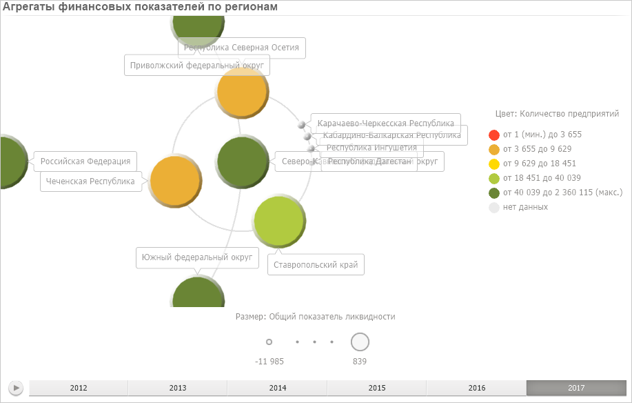 Для визуализатора «Пузырьковое дерево» доступны все операции с объектами, приведенные в разделах «Построение аналитической панели» и «Вставка и настройка визуализаторов».
