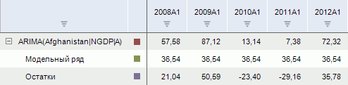 После применения метода в рабочей книге на основе каждого выделенного ряда будет создан вычисляемый ряд с наименованием вида «ARIMA(<Имя_Ряда>)», содержащий результаты расчета. Например:
