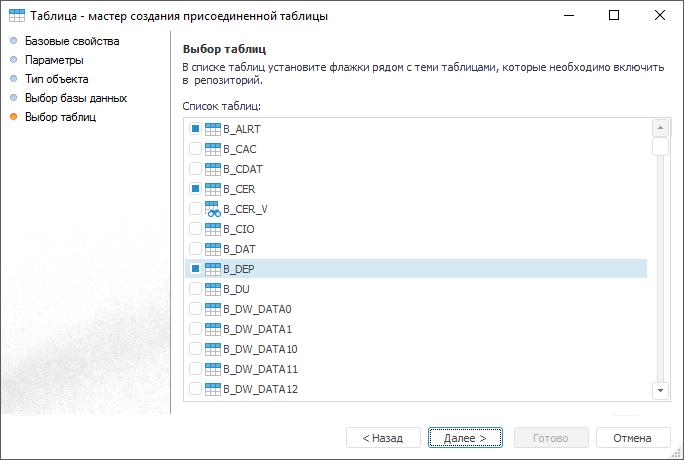 На странице «Выбор таблиц» выберите таблицы, которые будут включены в репозиторий. Для этого в списке таблиц установите флажки рядом с теми таблицами, которые необходимо включить в репозиторий в качестве присоединенных.